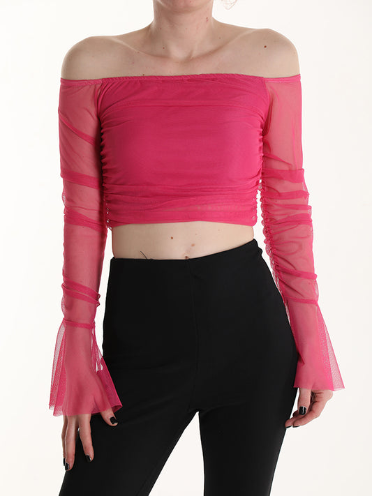 Lila-burgunderfarbene Bluse, Textur und transparente, weite Ärmel